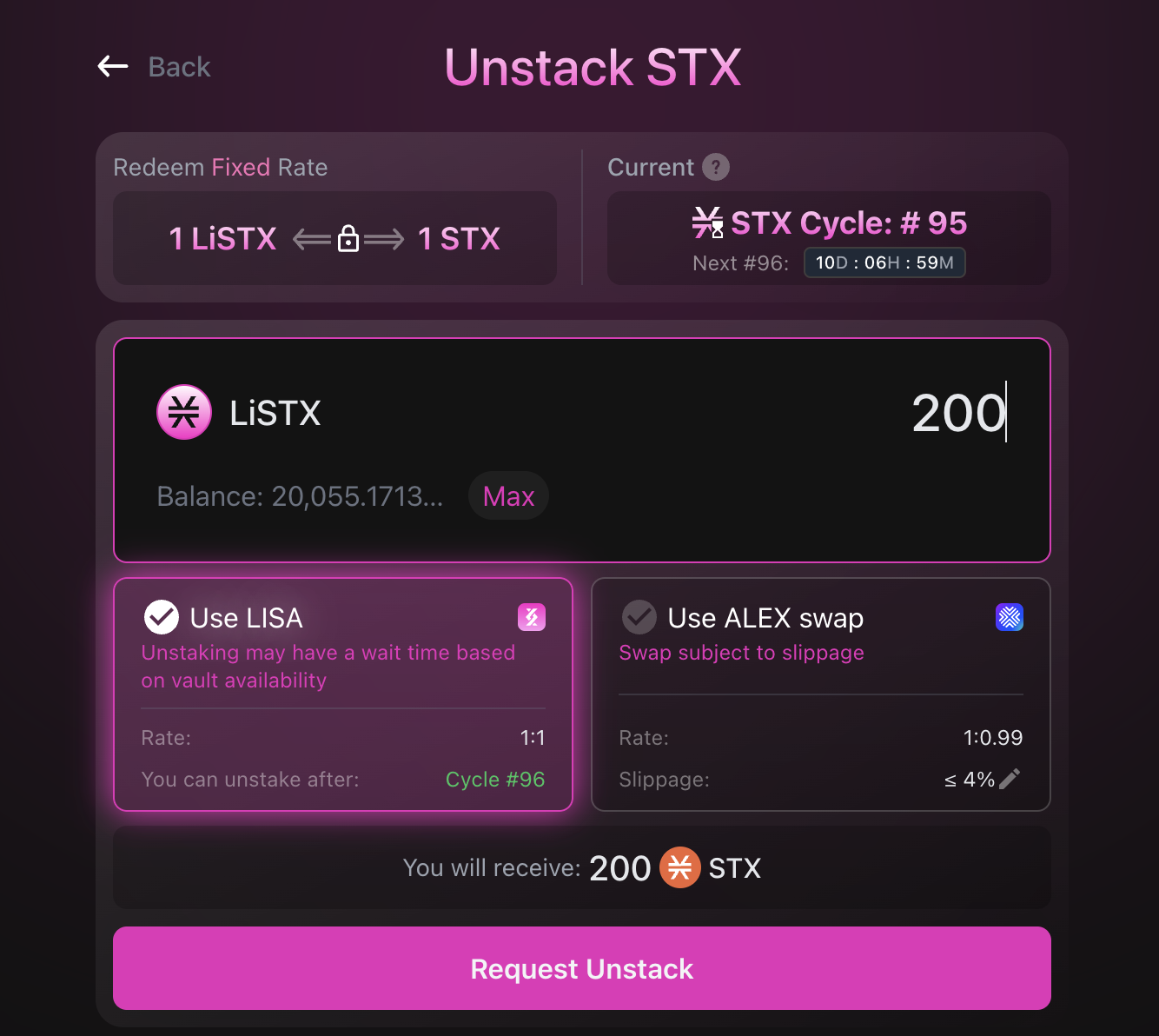 To understand the mechanism of how the unstacking works, please read [Withdrawing from LISA](https://docs.lisalab.io/~/changes/nTd2kdqu4i8fnOkHTWmm/features-how-tos/broken-reference).