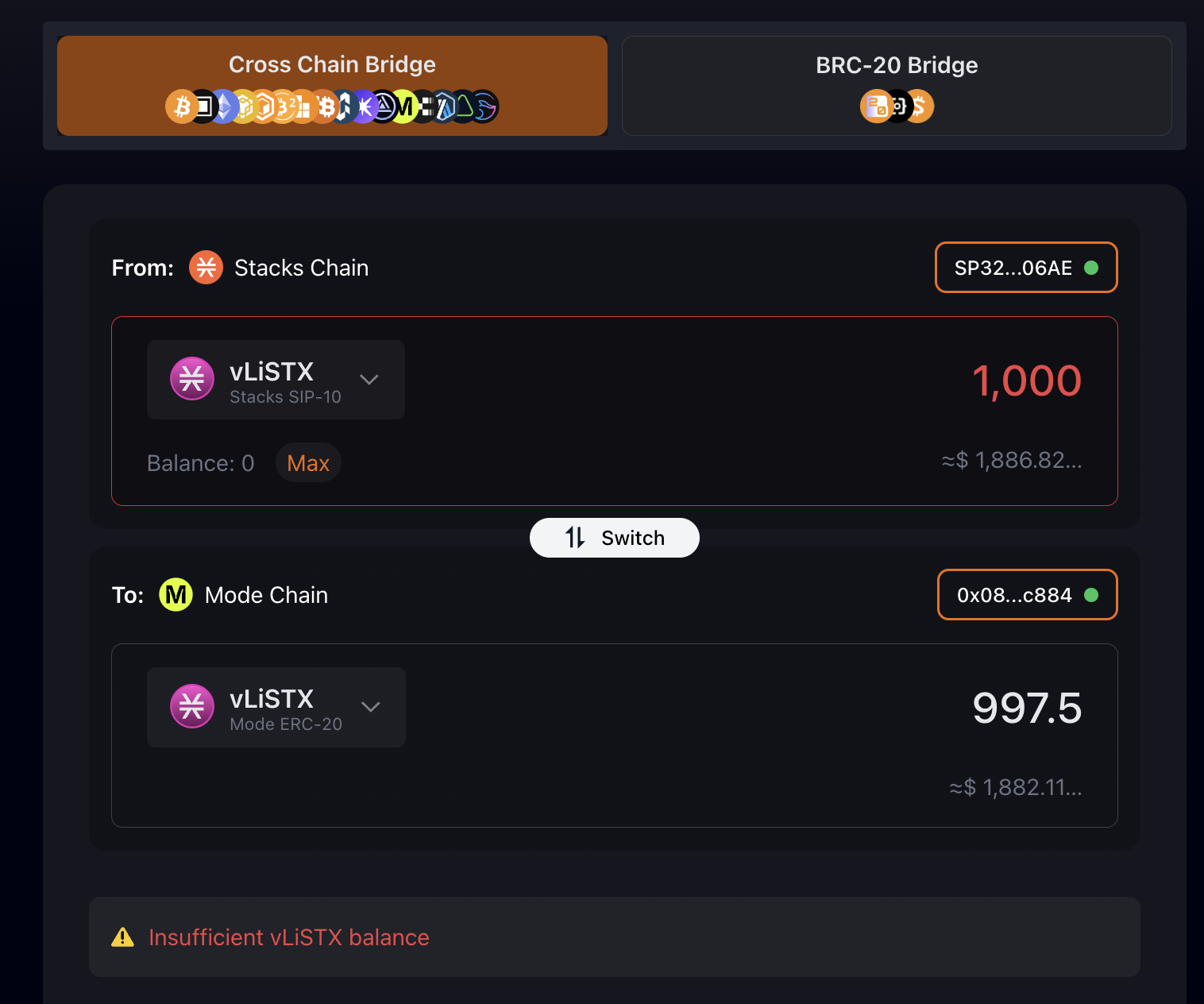3. Then, head to [XLink](https://app.xlink.network/bridge/cross-bridge) and connect your wallet that holds the vLiSTX.